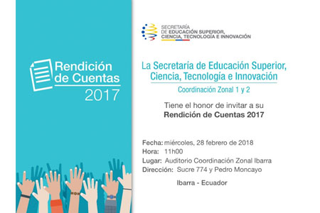En cumplimiento de la Ley Orgánica de Participación Ciudadana, la Coordinación Zonal 1 y 2 de la Secretaria de Educación Superior Ciencia Tecnología e Innovación (Senescyt), presentará este miércoles 28 de febrero el Informe de Rendición de Cuentas correspondiente a la gestión realizada en el año 2017.Este acto se desarrollará en el auditorio de la […]