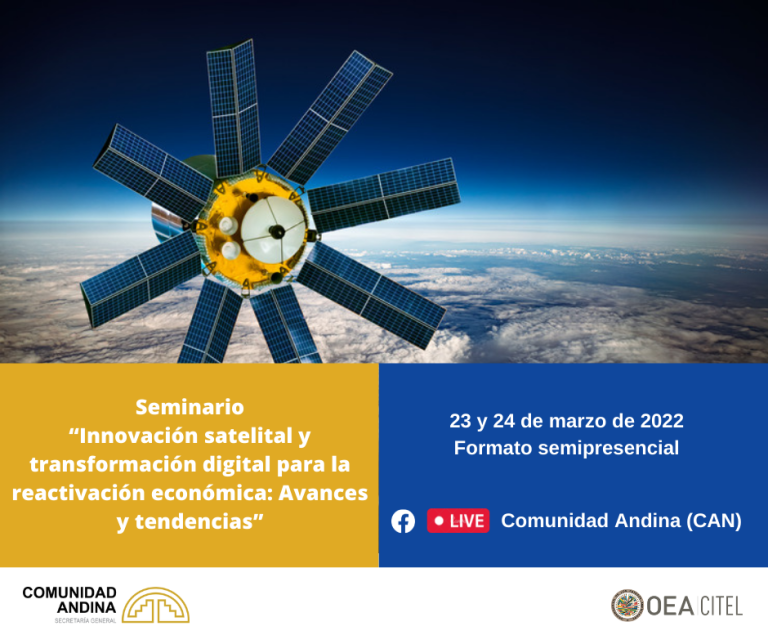 Innovación satelital, transformación digital y conectividad para la reactivación económica, serán los principales temas abordados en el seminario que realizará la Secretaría General de la Comunidad Andina y la Comisión Interamericana de Telecomunicaciones de la Organización de los Estados Americanos el próximo 23 y 24 de marzo.