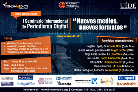 La Escuela de Comunicación de la Universidad Internacional del Ecuador (UIDE), la Red de Estudios y Enseñanzas de la Comunicación y Fundamedios invitan a la comunidad universitaria a participar en el Primer Seminario Internacional de Periodismo Digital “Nuevos medios, nuevos formatos, que se realizará el 23 de abril. Es un evento gratuito y destinado a […]