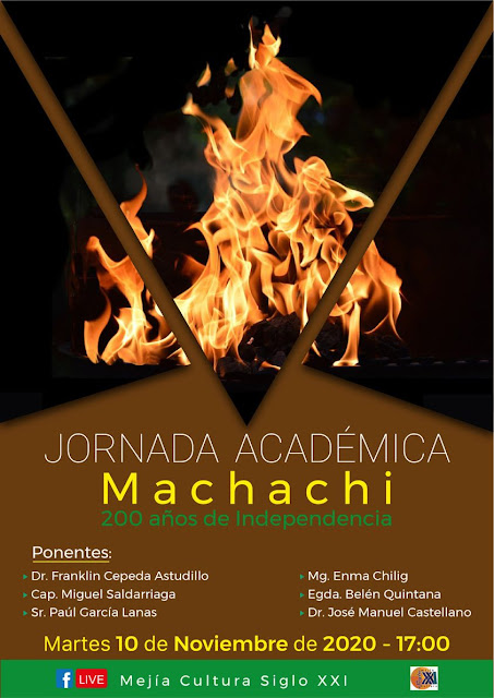 En el marco del Año del Bicentenario de Independencia de Machachi el colectivo Mejía Cultura Siglo XXI organiza una Jornada Académica virtual que se realizará el próximo martes 10 de noviembre a las 17:00 h., con las intervenciones del Dr. Franklin Cepeda Astudillo, Cap. Miguel Saldarriaga, Sr. Paúl García Lanas, Mg. Enma Chilig, Egda. Belén Quintana y el Dr. José Manuel Castellano.