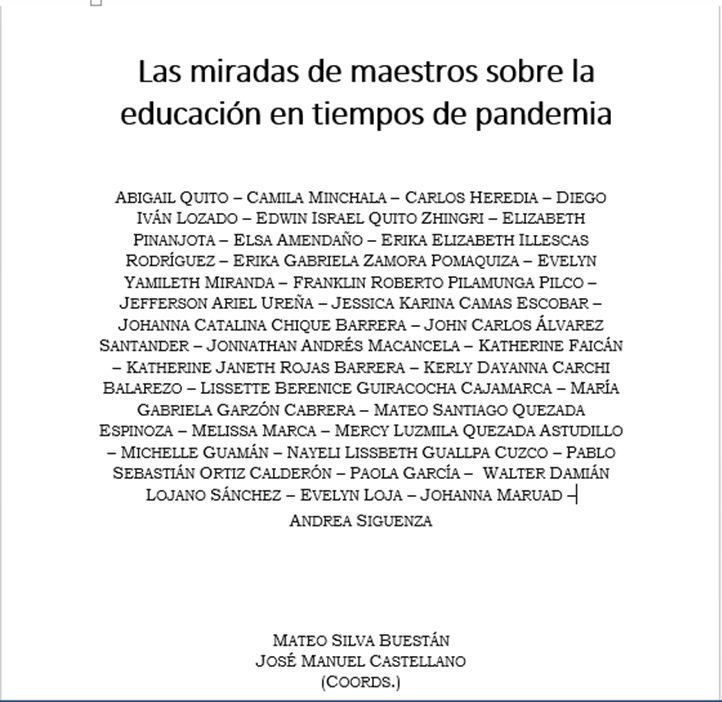 Este libro, “Las miradas de los maestros sobre la educación en tiempo de pandemia”, reúne treinta y tres entrevistas, que fueron seleccionadas entre los ciento trece alumnos universitarios, que participaron en este proyecto, integrado por tres paralelos de primer ciclo de la carrera de Educación Básica, correspondiente al semestre Septiembre 2020 – Marzo 2021 de la Universidad Nacional de Educación de Ecuador -UNAE-.