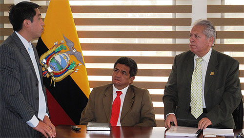 Pie de foto: Ing. Jonathan Mora, Eco. Guillermo Pozo, Presidentes de la Asociación de Transportistas Pesados del Carchi, y Dr. Hugo Ruiz, durante la entrega oficial del estudio técnico.